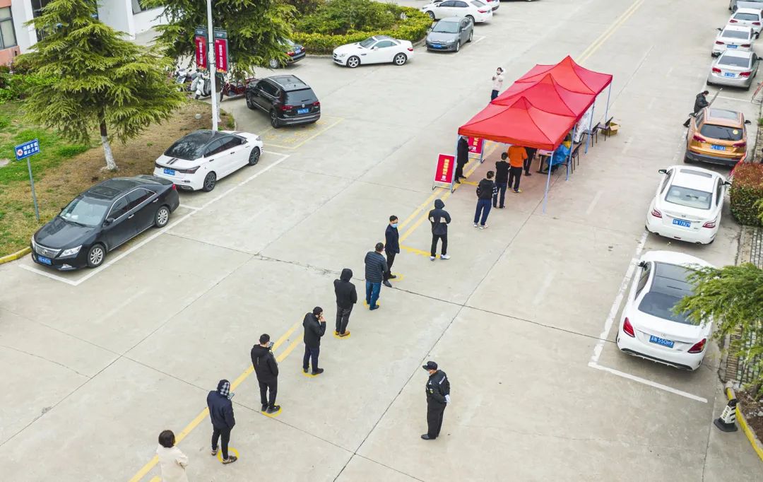 圖為3月21日,工業(yè)坊廠區(qū)各企業(yè)開展第二輪核酸抽檢工作,對保潔、保安、食堂工作人員做到每日一檢,工業(yè)坊各企業(yè)每天抽檢總人數(shù)的20%,做到一周內全員應檢盡檢。