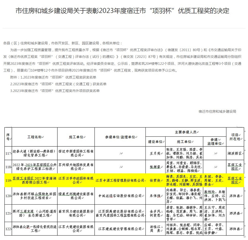 近日,園區(qū)口袋公園項(xiàng)目——蘇宿工業(yè)園區(qū)2022年青海湖西路微公園工程榮獲2023年度宿遷市“項(xiàng)羽杯”優(yōu)質(zhì)工程獎(jiǎng)。
