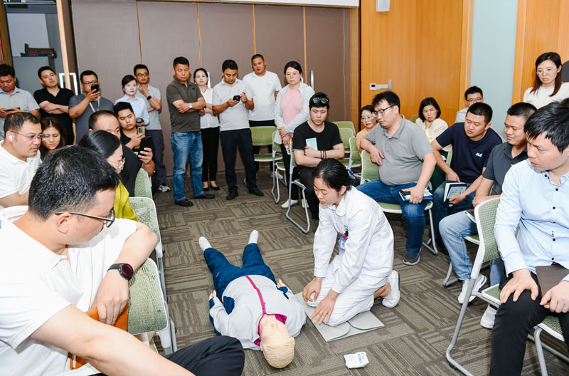 在第一階段活動(dòng)現(xiàn)場(chǎng),醫(yī)護(hù)人員通過(guò)PPT的形式,為大家詳細(xì)講解了心肺復(fù)蘇、AED使用、海姆立克急救法的操作要點(diǎn)和注意事項(xiàng),以及夏季高溫中暑的自救互救應(yīng)急處理知識(shí),并通過(guò)互動(dòng)方式一對(duì)一指導(dǎo)教學(xué),鍛煉了實(shí)際操作能力。隨后,醫(yī)護(hù)人員也為在場(chǎng)職工進(jìn)行血壓、血糖等項(xiàng)目測(cè)量,中醫(yī)把脈問(wèn)診、家庭醫(yī)生簽約等便民服務(wù),參加此次活動(dòng)的職工紛紛表示受益匪淺。