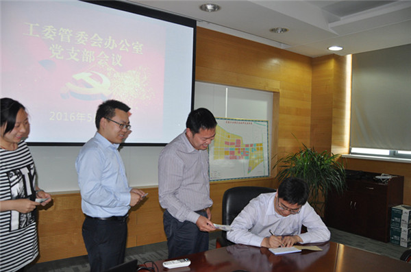 5月20日是園區(qū)工委管委會辦公室黨支部的黨員活動日?;顒赢斕?,黨支部全體黨員按照園區(qū)“兩學(xué)一做”學(xué)習(xí)教育部署開展集中學(xué)習(xí)。